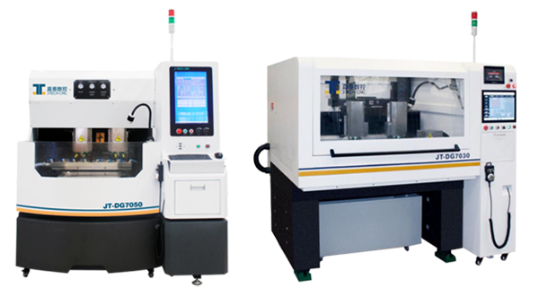 第三个展出的代表性机型——智能玻璃加工机系列JT-DG7030/DG7050,该系列产品主要专用于加工智能手机(苹果、三星、华为、OPPO等智能手机)、平板电脑、触摸、液晶、太阳能矽晶片、电子元件等产品的液晶屏玻璃的研磨等加工;主要性能特点是主轴转速可达60000-100000rpm,基础部件采用“济南青”大理石,提高整机刚性与稳定性;该机床可为蓝宝石加工提供整体解决方案;其中,FMS柔性制造系统为高端客户定制整条机械手自动化生产线。