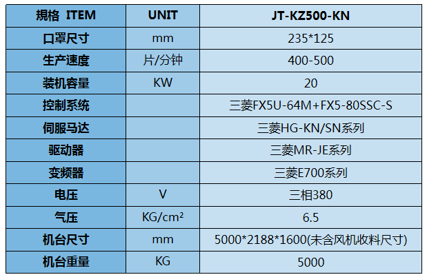 高速智能KN95口罩制片机JT-KZ500-KN是一台全自动化智能化的KN95口罩制片机,设备通过送料系统、布料成型系统、鼻梁条成型切割系统等工序的配合,生产出蝶形口罩的主体。整机从入料、鼻线插入、成型、裁切成品均为自动化作业,每分钟可生产500片以上。该生产设备性能稳定,产量高,良率高,易于操作。生产的KN95口罩佩带舒适,口罩过滤效果好,契合人的脸型。