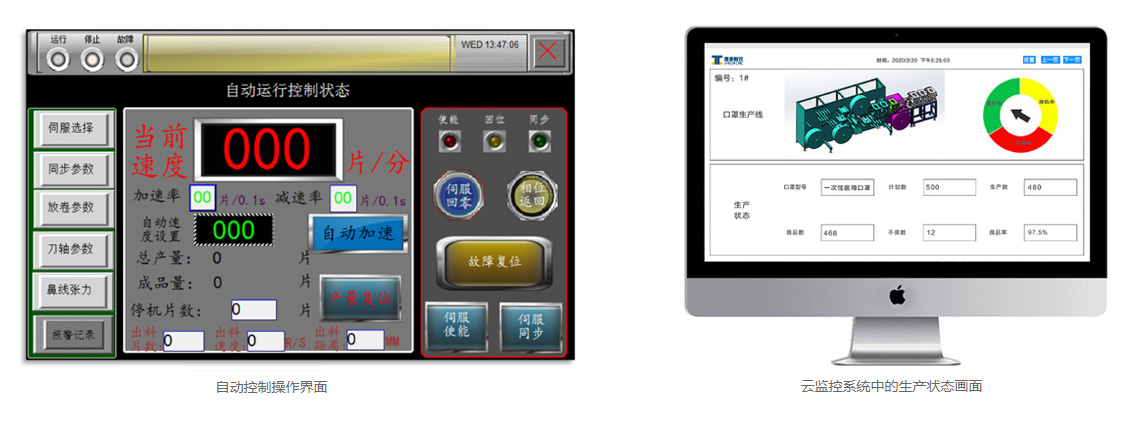 特点2:高度智能化 互联网远程运维、监控和管理,云监控系统对设备进行实时监控口罩的质量、产量和设备状态,并实时反馈给管理人员,高度智能化为产品质量和产能保驾护航。